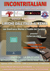 On Thursday, December 4th at 6:30 pm, the fourth edition of Incontri Italiani returns. The monthly series is created and promoted by Malindikenya.net at the Muthaiga Shopping Centre, in collaboration with the Italian Cultural Institute of Nairobi, Enoteca, and La Dolce Vita.