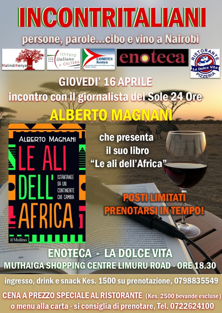 Giovedì 16 aprile alle ore 18:30, presso Enoteca Nairobi, si terrà un nuovo appuntamento di Incontritaliani, il ciclo di incontri dedicato alla cultura e alla comunità italiana in Kenya, organizzato da MalindiKenya.net in collaborazione con l’Istituto Italiano di Cultura di Nairobi, Comites Kenya, Enoteca Nairobi e La Dolce Vita Nairobi.
